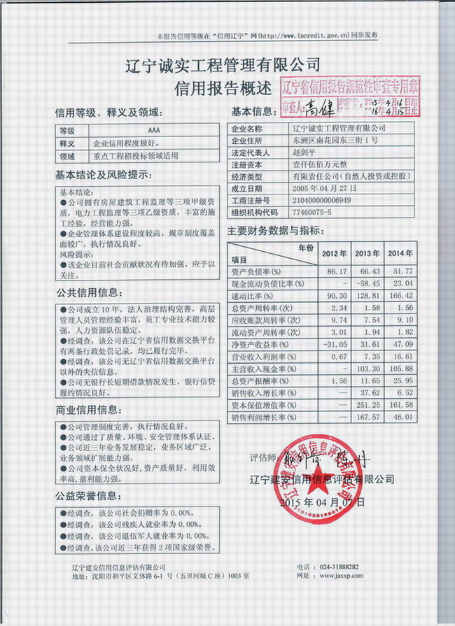 2015年4月,经辽宁建安信用信息评估有限公司信用评级委员会的评定,我公司被确定为最高信用等级“AAA”级。